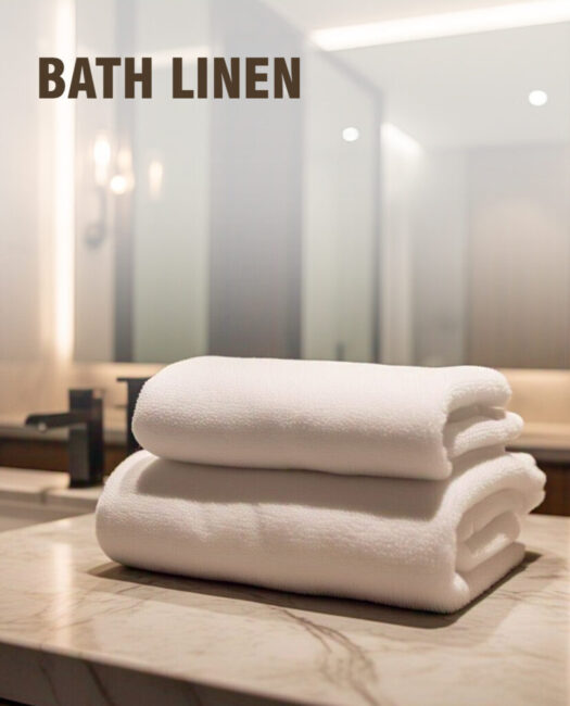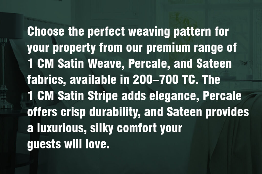 In hotel bed linen, we offer 1 CM Satin Stripe, Percale, and Sateen Weave fabrics with thread counts ranging from 200 to 700 TC.Our bath linen range includes 100% Cotton and Cotton Blends, available in 400 to 800 GSM, ensuring superior softness, absorbency, and durability.