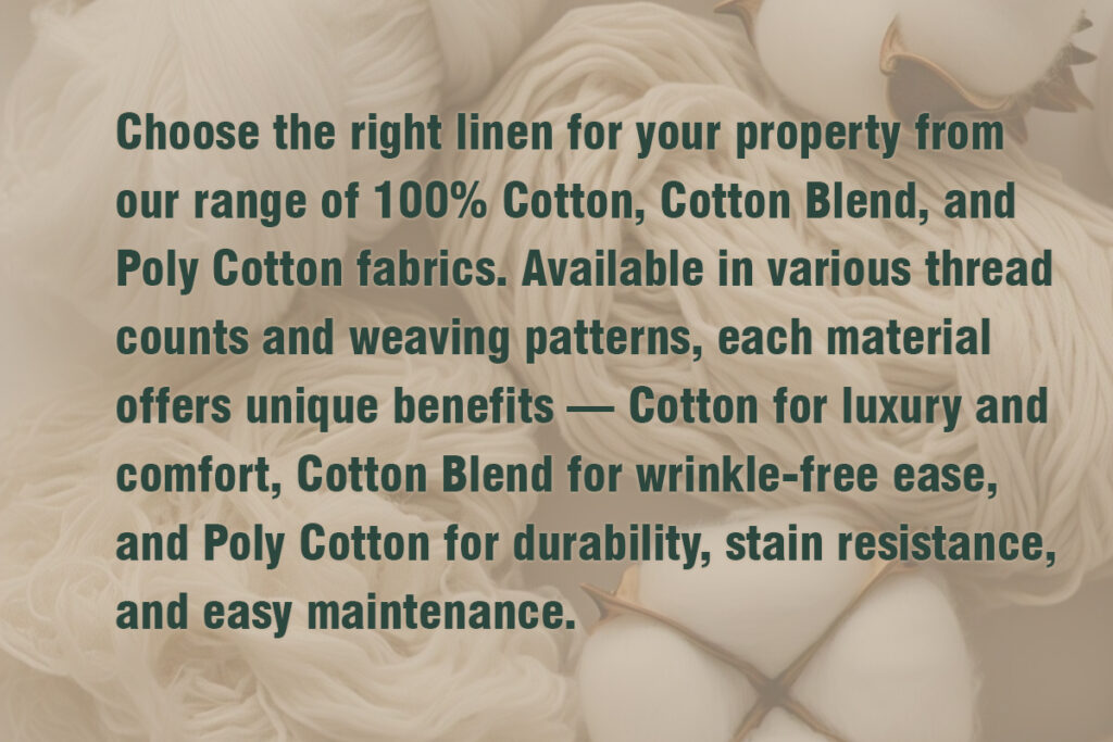 Asta Cotton offers a wide range of premium textile products tailored for the Hospitality Industry, Hospitals, and Spas.Our hospitality segment features an extensive selection of fabrics, including Pure Cotton, Cotton Blends, and Poly Cotton, perfectly suited for hotel bed and bath linen requirements across all categories.