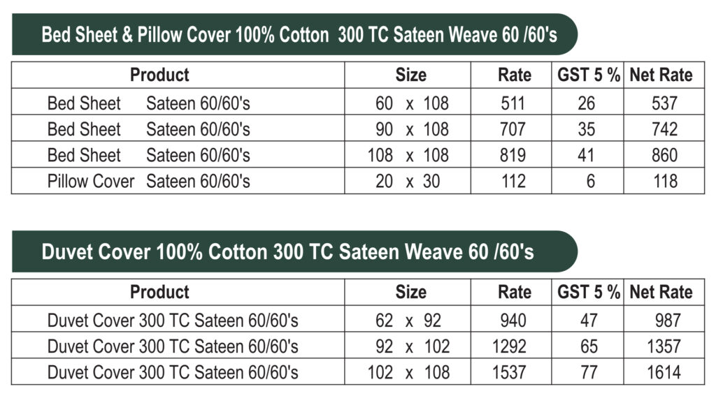 300 TC Sateen Weave 60/60’s 100% Cotton Bed Linen