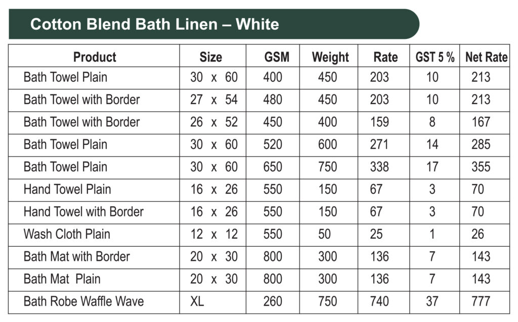 We offer cotton blend bath towels in multiple sizes — 26” x 52”, 27” x 54”, and 30” x 60”, with GSM options ranging from 400 to 650, catering to different property requirements. The hand towel is available in 16” x 26”, and the face towel in 12” x 12”, both providing excellent absorbency and softness. In addition, our cotton blend bath mat comes in 800 GSM, available with or without a border, offering superior strength and water absorbency for daily hotel use.