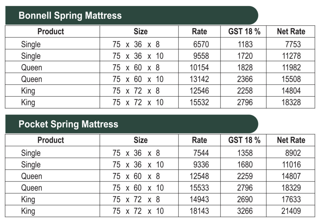 75” x 72” (King Size) Available in 8-inch and 10-inch thickness options for both Bonnel and Pocket Spring models.
