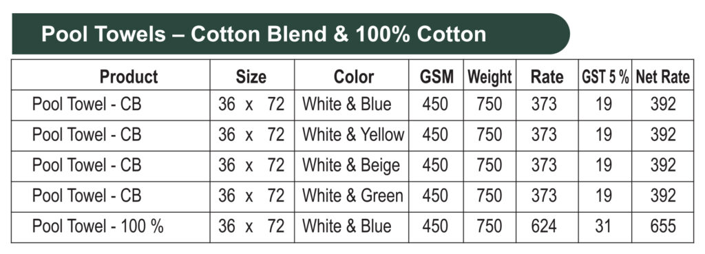 Measuring 36″x72″ and weighing 750 grams with 450 GSM, these towels offer superior softness, quick drying, and durability, making them ideal for resorts, hotels, gyms, and home use. Perfect for daily use or as stylish poolside essentials, our striped cotton and cotton blend towels combine functionality with aesthetic appeal, ensuring long-lasting comfort and luxury.